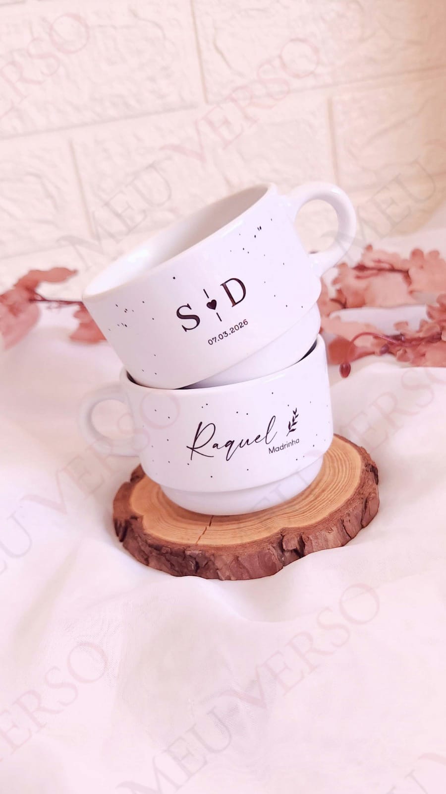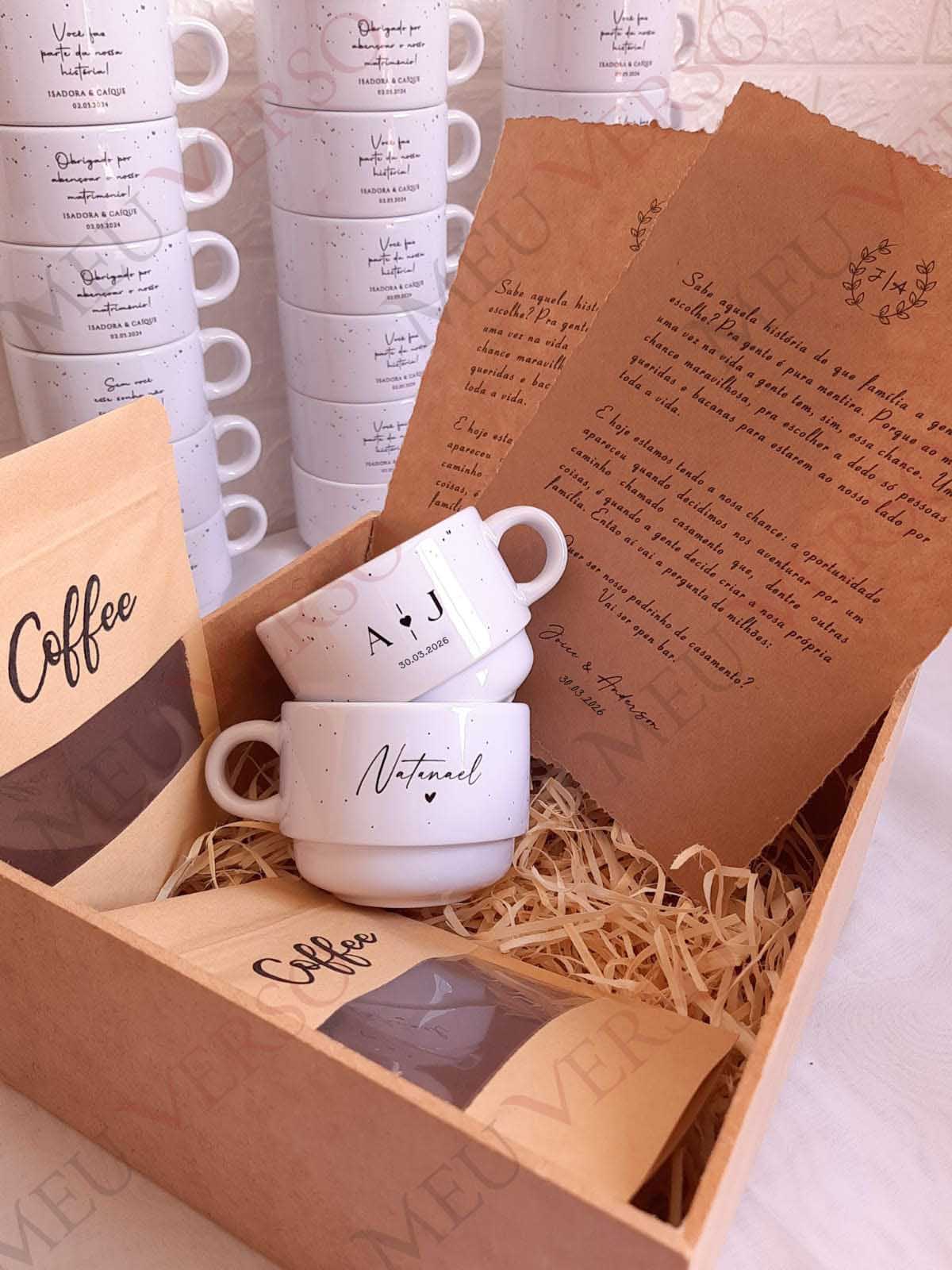 2 xícaras 150ml + 2 sachês de café + 1 pergaminho + 1 caixa MDF personalizada com as iniciais dos noivos
