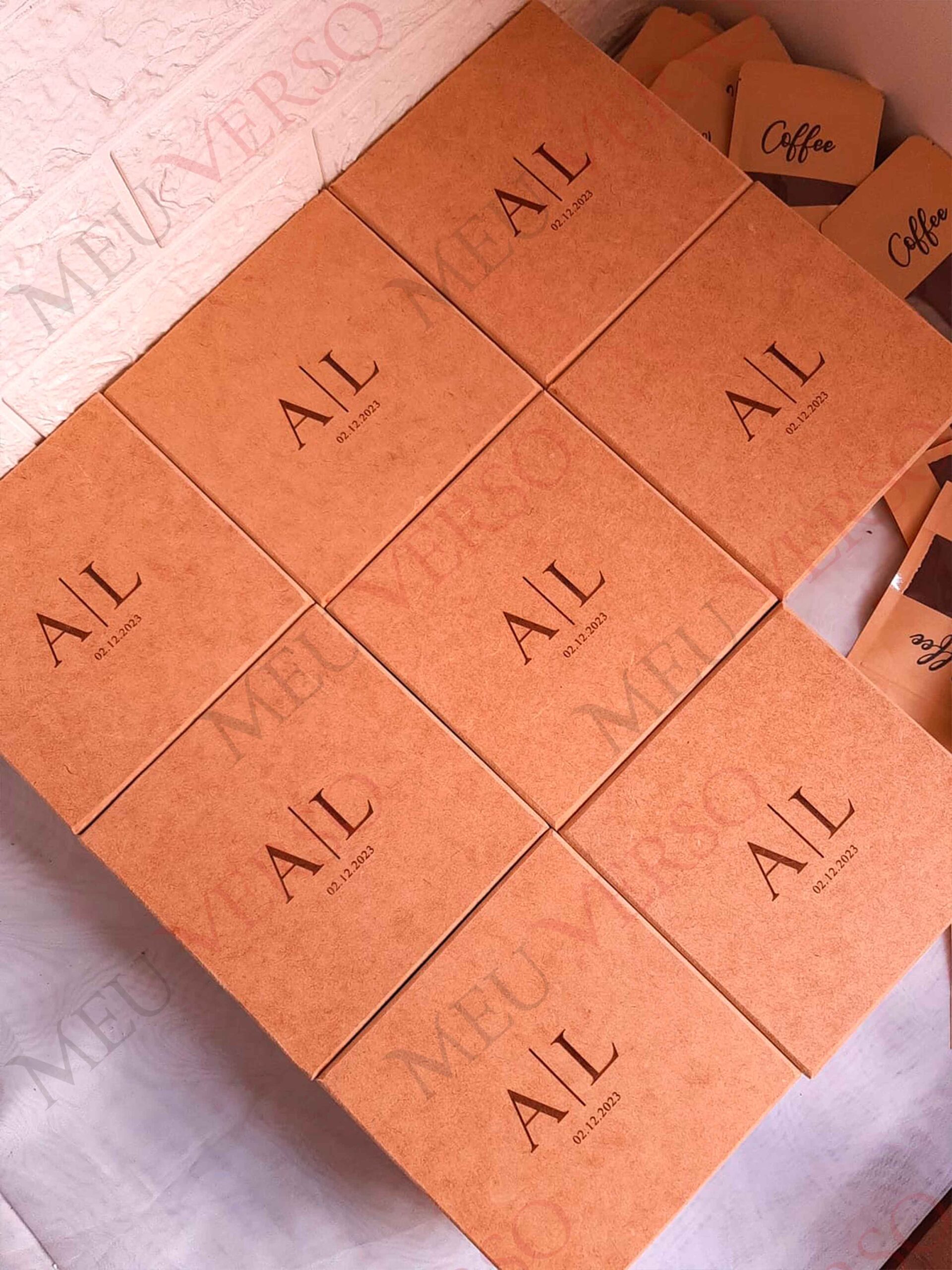 2 xícaras 150ml + 2 sachês de café + 1 pergaminho + 1 caixa MDF personalizada com as iniciais dos noivos